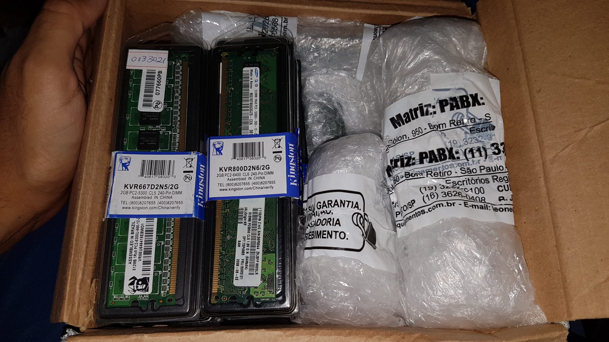 Para a minha surpresa, o nível de capricho foi grande, com memórias dentro de cases, todas muito bem envelopadas com plástico bolha, sendo que foram mais ou menos 50 chips de memória, que poderemos brincar bastante aqui na empresa.