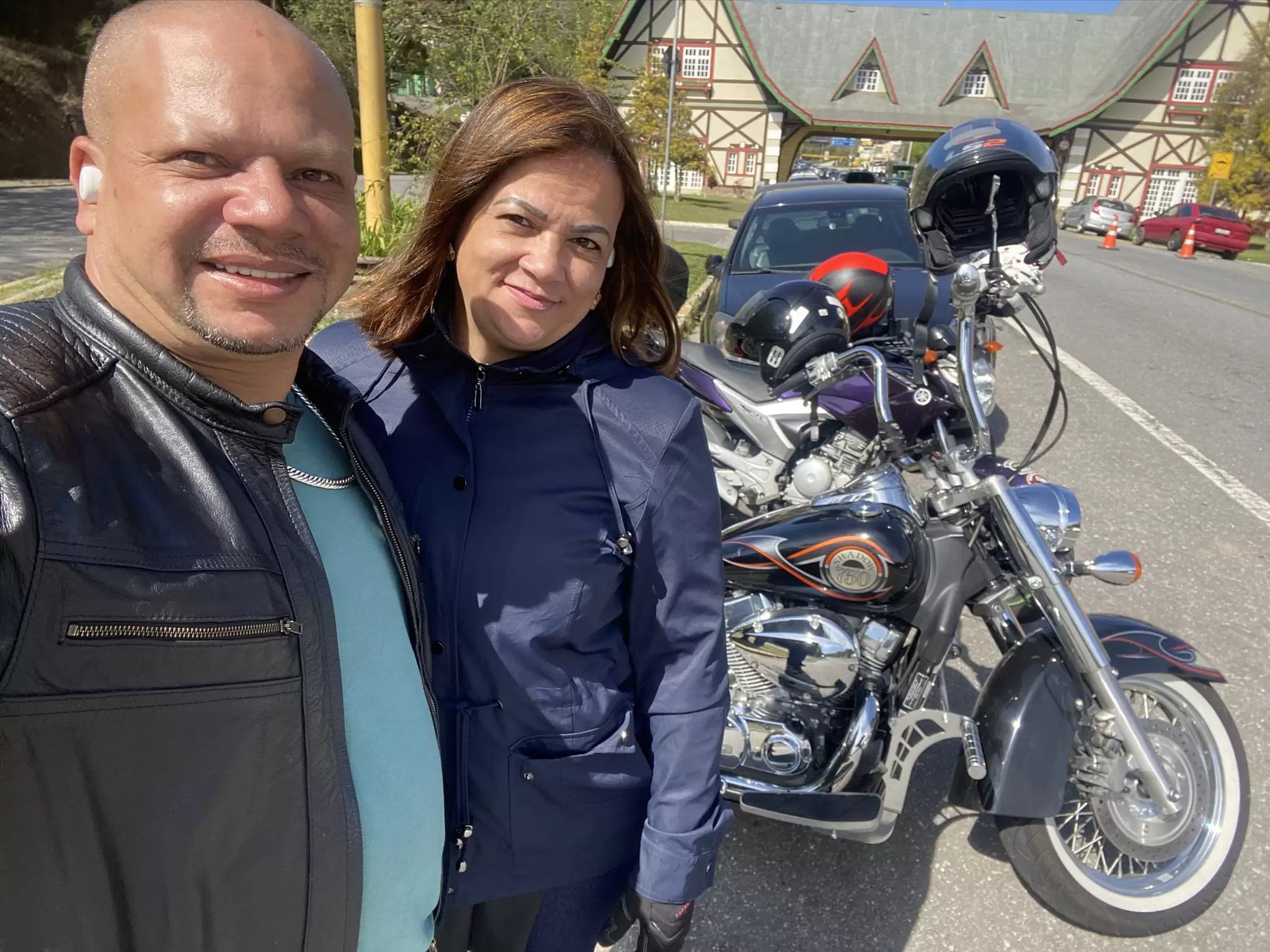 Luiz e sua esposa Marcelia com sua Shadow 750 ao fundo, com o que mais gostam de fazer, passear de moto